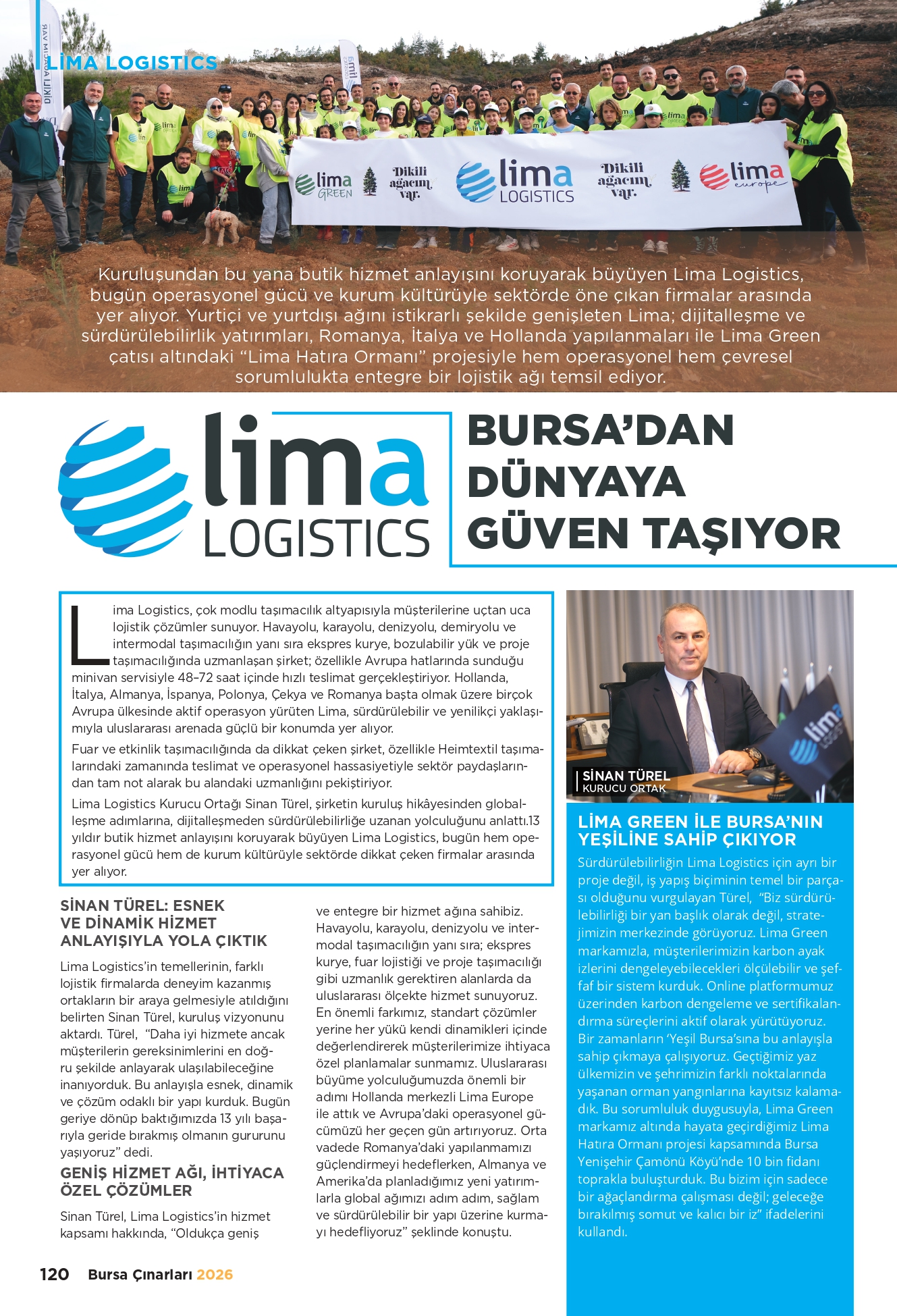 Bir zamanların ‘Yeşil Bursa’sına bu anlayışla sahip çıkmaya çalışıyoruz. Geçtiğimiz yaz ülkemizin ve şehrimizin farklı noktalarında yaşanan orman yangınlarına kayıtsız kalamadık. Bu sorumluluk duygusuyla, Lima Green markamız altında hayata geçirdiğimiz Lima Hatıra Ormanı projesi kapsamında Bursa Yenişehir Çamönü Köyü’nde 10 bin fidanı toprakla buluşturduk. Bu bizim için sadece bir ağaçlandırma çalışması değil; geleceğe bırakılmış somut ve kalıcı bir iz” ifadelerini kullandı.
